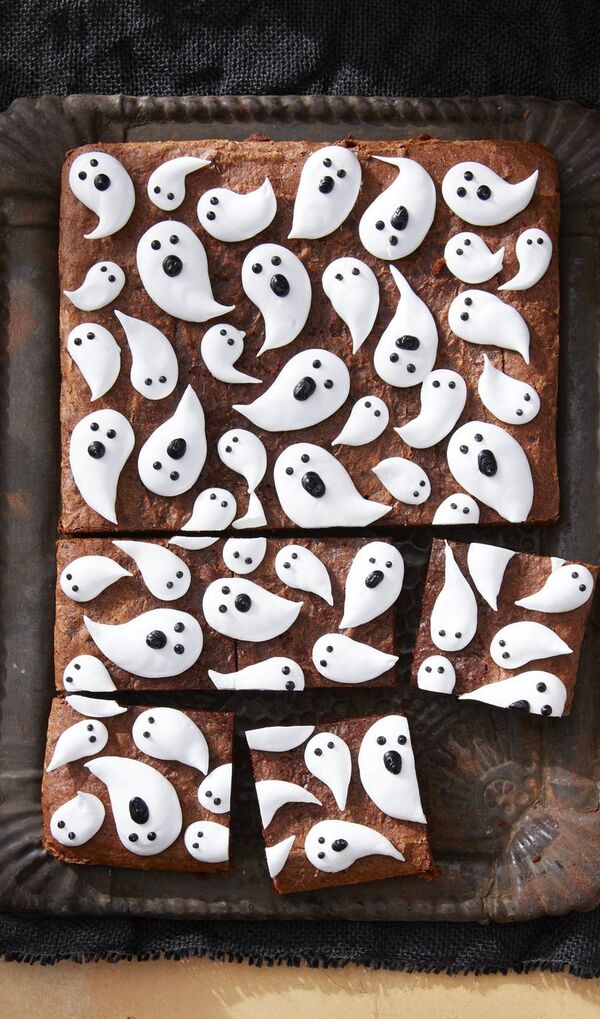 Aggiungere la gelatina filtrata e ammorbidita alla miscela di zucchero. Sbattere con un mixer elettrico a media velocità per circa 3 minuti. Aumentare la velocità e mescolare fino alla formazione di picchi morbidi, in un tempo compreso tra 8 e 10 minuti. Trasferire il composto di marshmallow così ottenuto in un sacchetto per le tubature. Con la sacca da pasticcere, distribuire i marshmallow direttamente sui brownies. Lasciare asciugare per almeno un''ora, quindi disegnare gli occhi e la bocca con la glassa nera. I brownies sono pronti per essere serviti.*Immagine di Tara Bench
