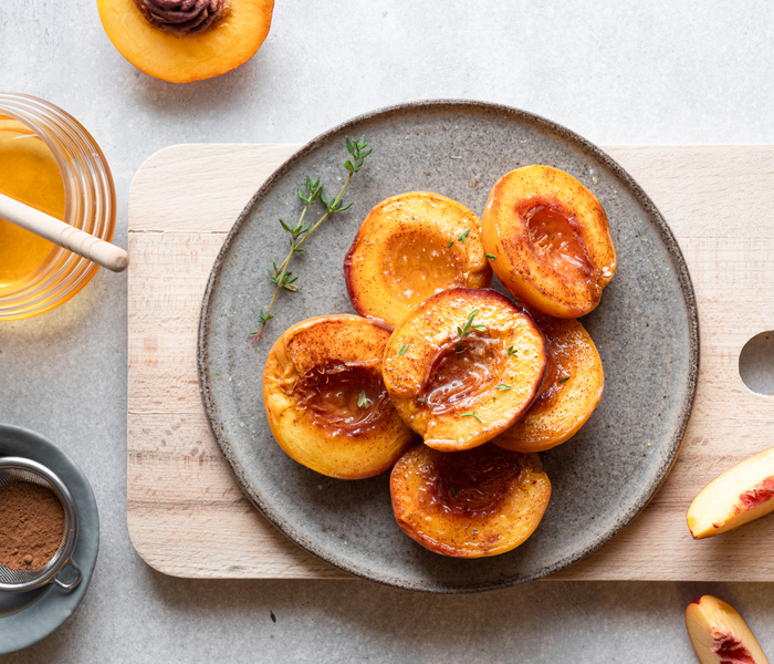 Cotte al forno alla perfezione, le pesche si caramellano e diventano ancora più dolci, mentre i dolcificanti naturali, la vaniglia e la cannella aggiungono le loro note magiche. Servitele calde con gelato alla vaniglia o yogurt greco rinfrescante per una perfetta armonia di sapori.
